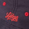 Taille unique – 100 % coton – Bleu marine avec doublure du bas en rouge – Blason en silicone avec éléments en relief – Broderie fine “Liège” sur le côté – Œillets brodés en rouge