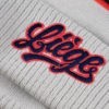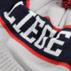 Bonnet gris avec pompon de couleur bleu marine et rouge Broderie Liège en face avant Composition : 100% Acrylique