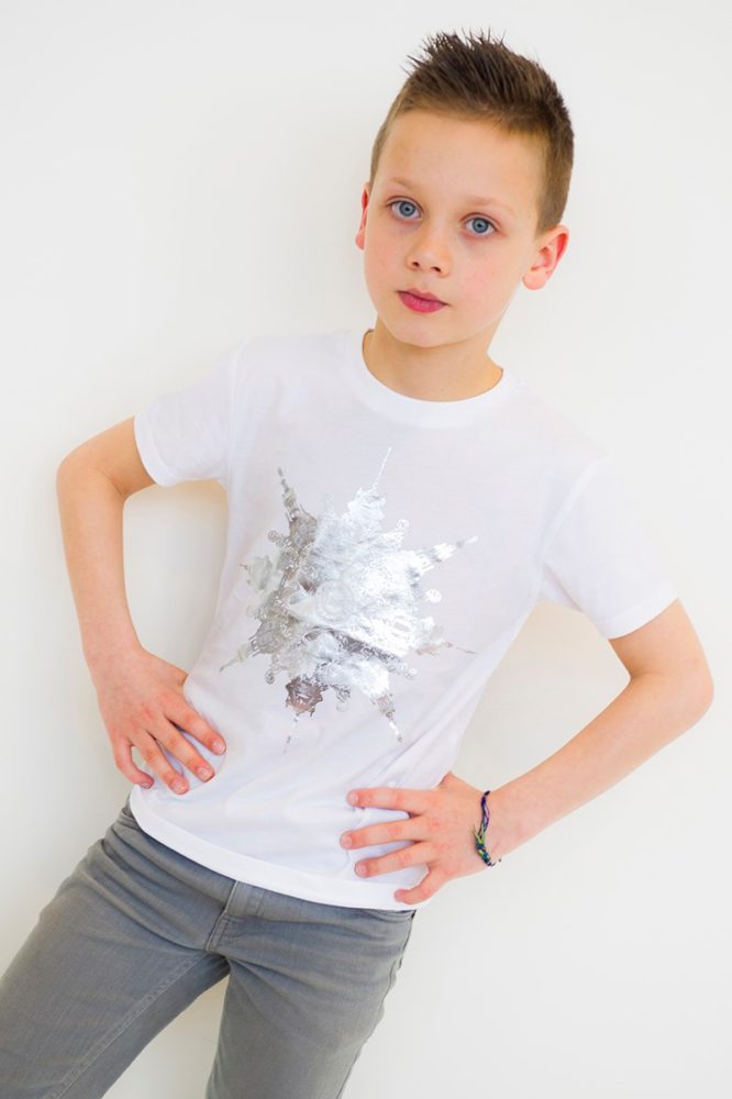 La deuxième gamme reprend une rose des vents montoise spécialement dessinée pour l’évènement par Jean-Paul Lespagnard sur un t-shirt blanc de belle coupe. Une technique de collage très astucieuse a dû être utilisée pour rendre possible l’apposition d’une feuille d’aluminium extra fine afin de doter cette dentelle architecturale du rendu miroir souhaité par le célèbre couturier liégeois